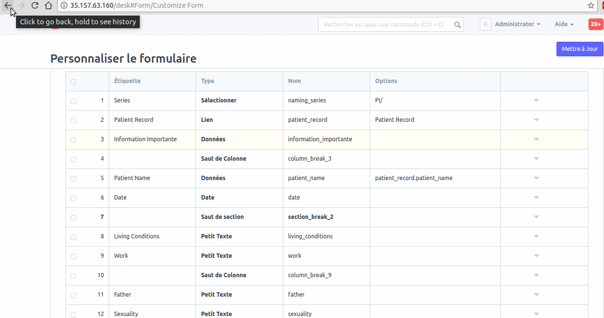 Dans notre exemple, nous voulons mettre un champ "Information Importante" sous le champ "Dossier Patient". Il va juste falloir trouver le champ "Dossier Patient": il s'agit de "Patient Record".